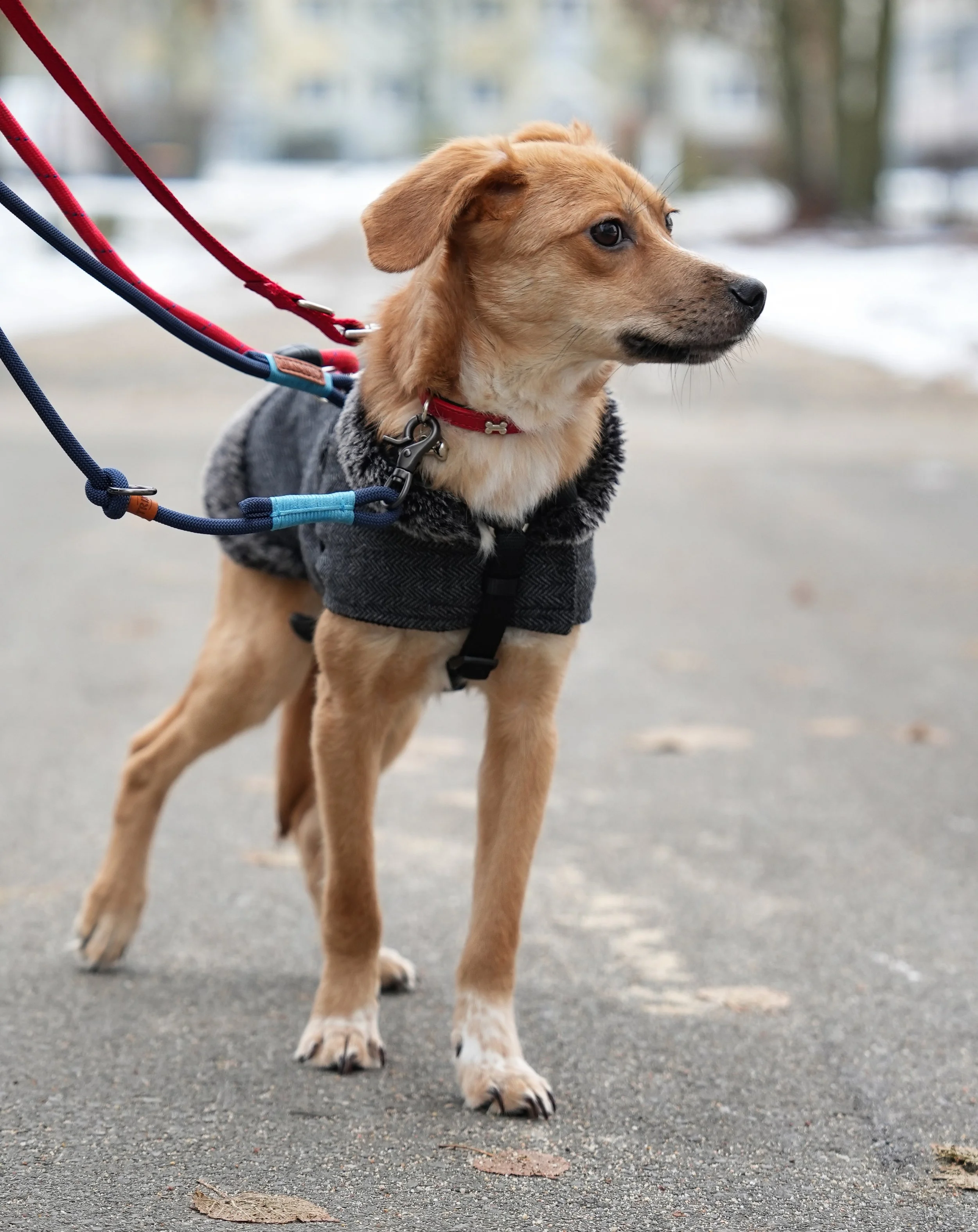 Eine einzelne Leine oder ein einzelnes Geschirr kann sich in solchen Momenten lösen oder verrutschen. Mehrere Sicherungen verhindern, dass der Hund entkommt oder sich verletzt und geben ihm gleichzeitig die nötige Sicherheit, um Schritt für Schritt Vertrauen aufzubauen.
